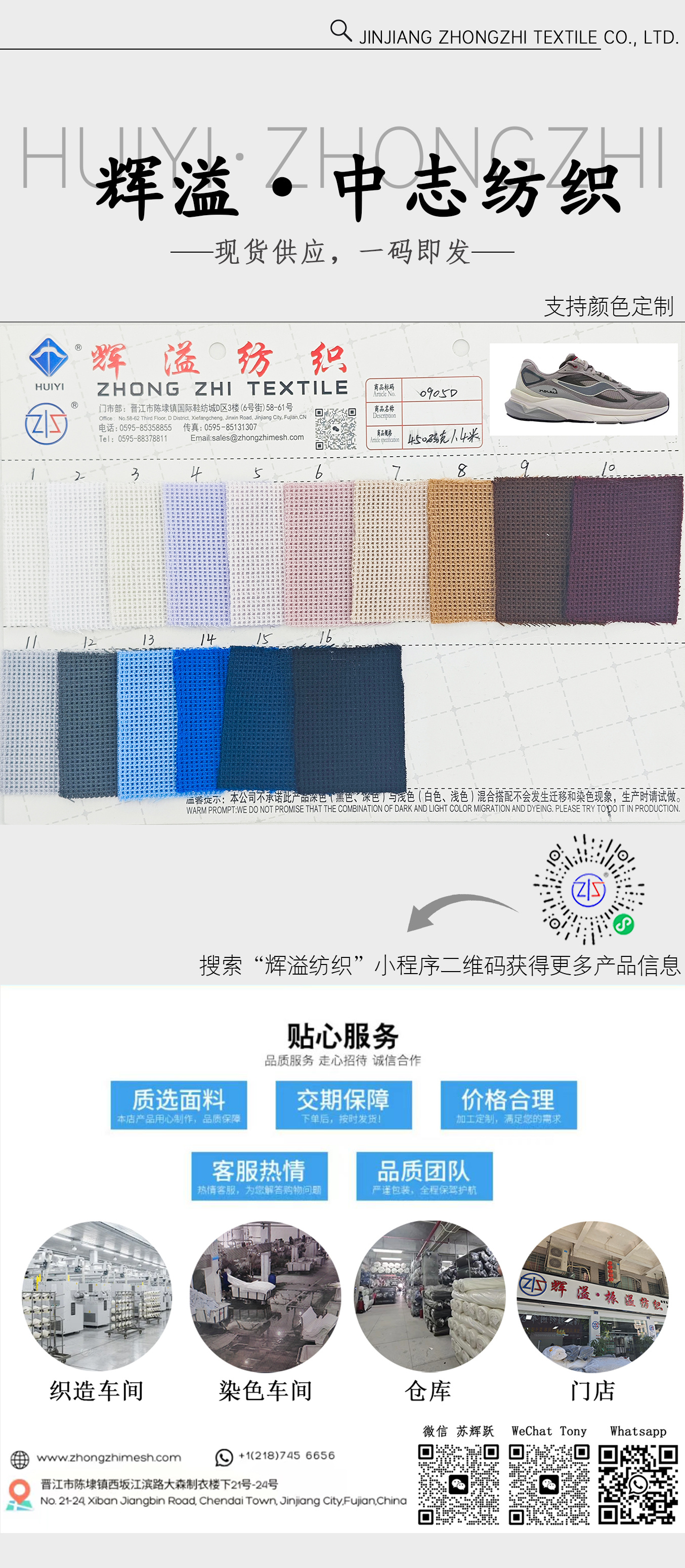 Основано в 2008 году, Цзиньцзян Чжунчжи Текстильная Компания, ООО является ведущим производителем высокопроизводительных Спортивные сетчатые ткани для обуви , включая Сэндвич-сетка, однослойная сетка, жаккардовая сетка, 3D-сетчатая ткань И так далее Путём постоянных инвестиций в Передовые технологии и акцент на инновация , компания выросла из местного поставщика в надежного партнера для Глобальные бренды .